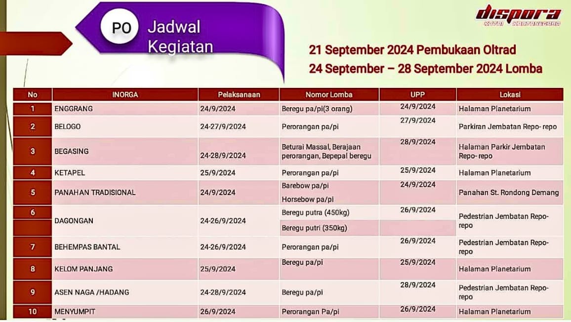 – Asen Naga/Hadang akan dilaksanakan pada 24-28 September 2024 di Pedestrian Jembatan Repo-Repo, dengan kategori beregu putra/putri.